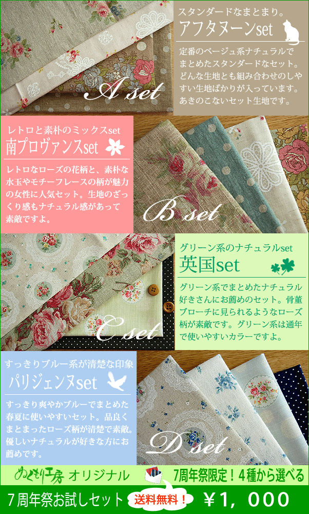 7周年祭プレイベントお試しセット第1弾【送料無料】【20100316_手芸同好会】【souryo-sale★0402★】 価格: 1,000円 レビュー評価: 4.75 レビュー数:777 ●お試しセットは毎回、内容に変化がございます。 お楽しみに! ■セット内容 ■お届け方法 ※数量2までは、メール便発送となります。 その他商品と同梱の場合でも容量内は、 メール便にて発送致します。 ※代引の場合、別途315円の手数料が必要です。 ■ご注意 【買い物カゴに入れた注文確定前のご注文分】は在庫の確保はできておりません。 ページ上で売切れ後のご注文分はお断りさせていただいております。ご了承下さいませ。 買い物カゴに入れてから時間を置いた場合はページ上の在庫をご確認の上、ご注文確定をお願い致します。はじめてのご来店の方にお買い物上手な常連さんもぜひ!絶対お得な『お試しセット』出荷数8,6 Supported by 楽天ウェブサービス |